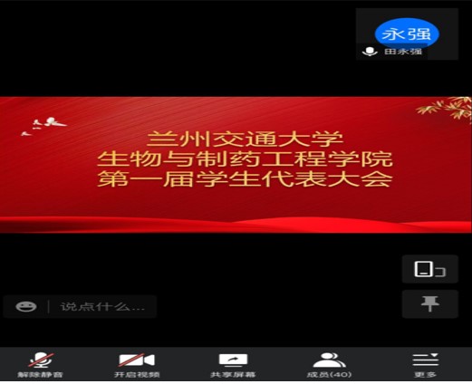 在校学生会和学院党委、团委的指导和关怀下,经过学生干部和指导老师近两个月的精心筹备,兰州交通大学生物与制药工程学院第一次学生代表大会于2021111216:30顺利召开。