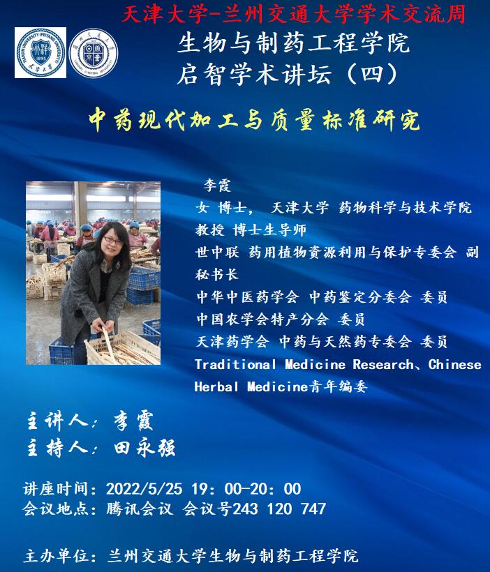 2022年5月23日-2022年5月28日为天津大学-兰州交通大学学术交流周,学院特邀请天津大学教授、博导 李霞老师与生物与制药工程学院副教授、硕导 谢放老师并两校师生进行学术交流。具体时间为5月25日19:00-20:00,地点为腾讯会议,会议预约号为243 120 747,请全体师生准时参加。