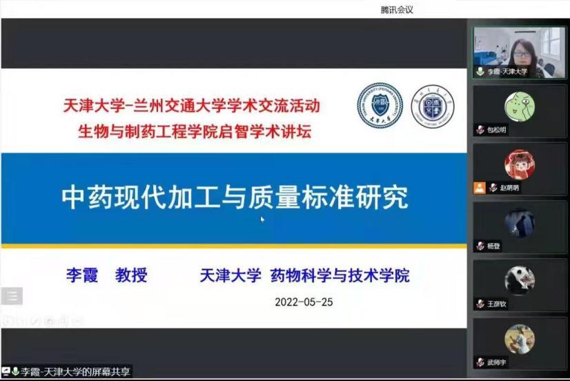 5月25日晚,生物与制药工程学院“天津大学-兰州交通大学学术交流周活动”拉开了序幕。天津大学药物科学与技术学院李霞教授受学院邀请,远程为天津大学和兰州交通大学师生作了题为《中药现代加工与质量标准研究》的线上学术报告。天津大学部分教工、生物与制药工程学院全体教工、研究生、本科生等80多人参加并聆听了本次报告。