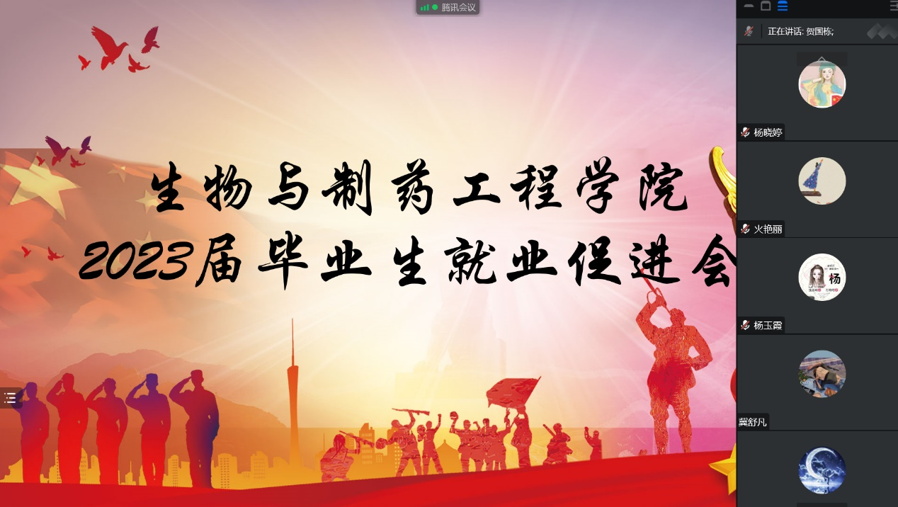 根据学校2023届毕业生就业工作推进会的会议精神生物与制药工程学院召开了2023毕业生就业宣讲动员线上会议,学院党委书记何亚军、院长田永强、分管研究生和本科生院领导、毕业班班主任全体23届毕业生参加了会议。