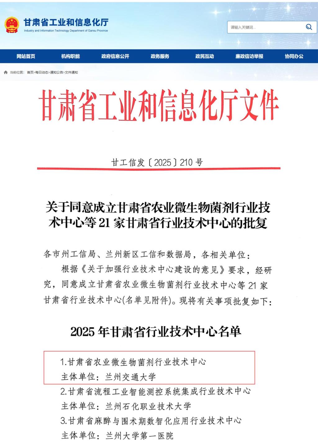 近日,甘肃省工业和信息化厅下发通知,由我院申报的“甘肃省农业微生物菌剂行业技术中心”成功获批。该中心的设立,标志着我院在农业微生物领域的科研实力、技术创新与产业服务能力获得了省级主管部门的高度认可,是我院省级科研平台建设的又一项重大突破。