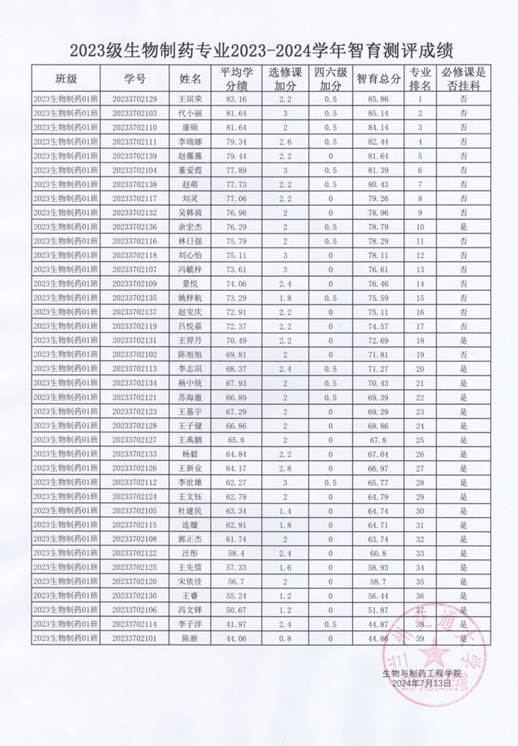 生物与制药工程学院2023级智育成绩及排名结果公示