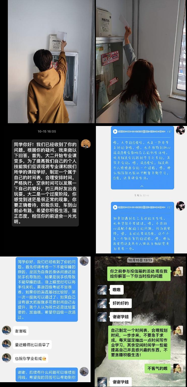本次活动于九月二十二日举办完成,同学们利用课余时间,将写好的纸条投入到生物与制药工程学院一楼到二楼拐角处消防栓上的信箱里,随后,热心的学长学姐在手机上逐一为新生们解答问题。