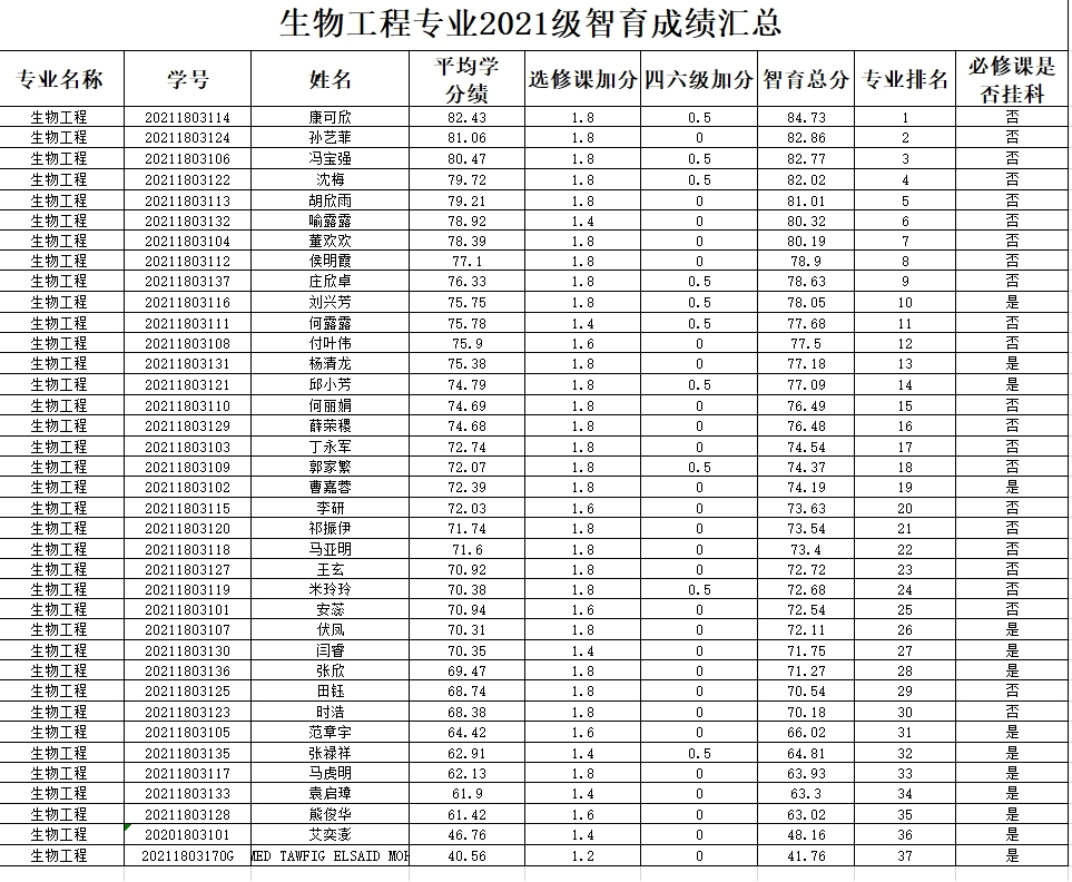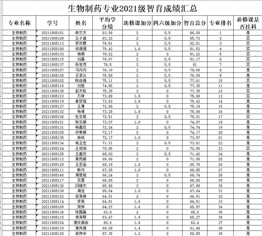生物与制药工程学院 关于2021级优秀本科生转专业智育成绩及排名结果的公示